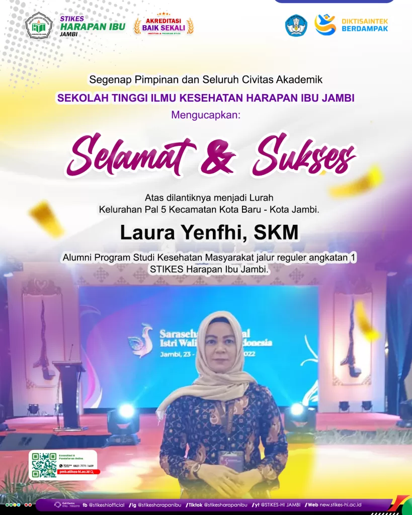 Selamat dan Sukses atas pelantikkan Ibu Laura Yenfhi, SKM sebgai Lurah Kelurahan Pal 5 Kecamatan Kota Baru Kota Jambi. Alumni Prodi Kesehatan Masyarakat Angakatan 1