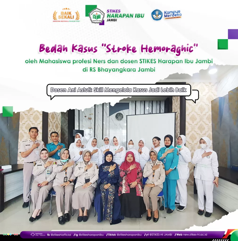 Jambi, STIKES Harapan Ibu-Sekolah Tinggi Ilmu Kesehatan Harapan Ibu Jambi telah melaksanakan kegiatan Bedah Kasus dalam rangka Praktik Profesi Keperawatan Medikal Bedah I (PPKMB 1) dimana dalam kegiatan ini mahasiwa profesi ners melakukan pengelolaan kasus yang kemudian dipresentasikan dan dibahas bersama perawat Rumah Sakit Bhayangkara yang dilaksanakan di Rumah Sakit Bhayangkara Jambi, Kota Jambi. (07/12/2023).