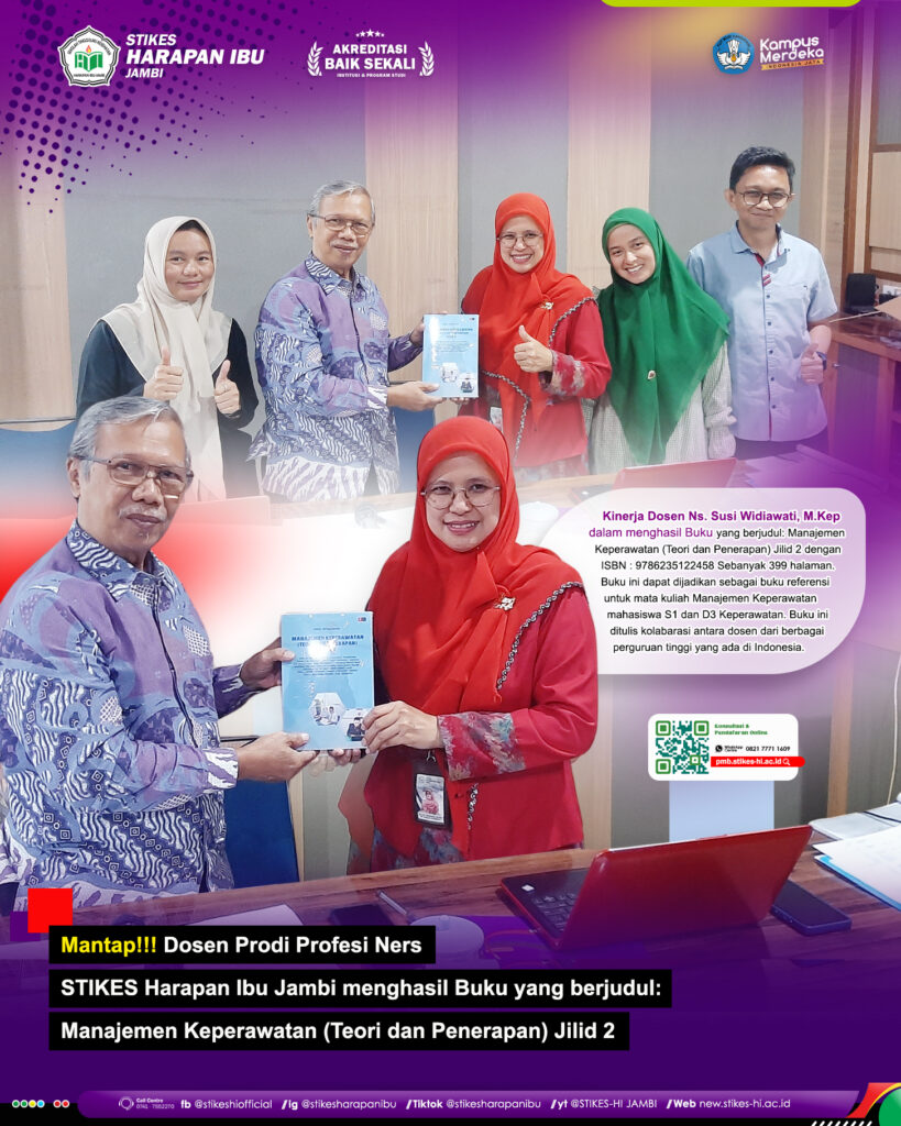 Kinerja Dosen Ns. Susi Widiawati, M.Kep dalam menghasil Buku yang berjudul : Manajemen Keperawatan (Teori dan Penerapan) Jilid 2 dengan ISBN : 9786235122458 , dengan 399 halaman Buku ini dapat dijadikan sebagai buku referensi untuk mata kuliah Manajemen Keperawatan mahasiswa S1 dan D3 Keperawatan. Buku ini ditulis kolabarasi antara dosen dari berbagai perguruan tinggi yang ada di Indonesia.