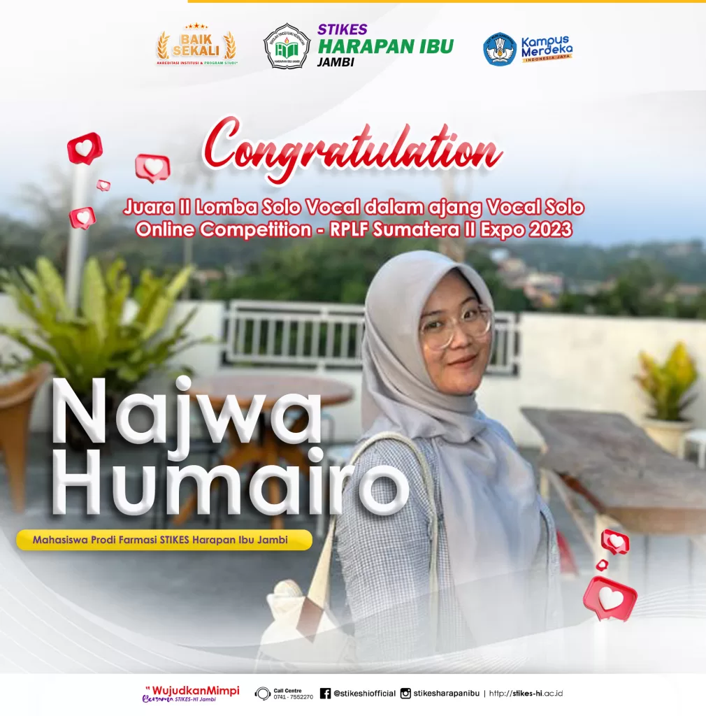Selamat Kepada “Najwa Humairo” Mahasiswa Farmasi yang berhasil meraih Juara II dalam ajang Vocal Solo competition Region Pharmaceutical Leadership Forum atau RPLF Wilayah Sumatera II Expo Tahun 2023.