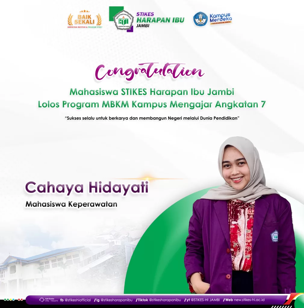 Selamat kepada Cahaya Hidayati Mahasiswa Ilmu Keperawatan STIKES Harapan Ibu Jambi yang sudah Lolos Program MBKM Kampus Mengajar Angkatan 7. “Sukses selalu untuk berkarya dan membangun Negeri Melalui Dunia Pendidikan”