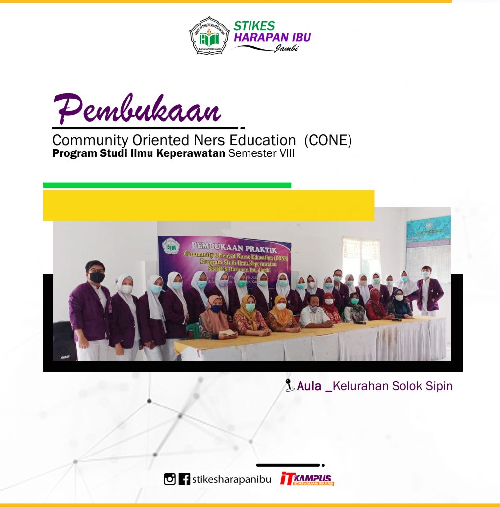 Program Studi Ilmu Keperawatan Sekolah Tinggi Ilmu Kesehatan Harapan Ibu Jambi melaksanakan kegiatan pembukaan Community Oriented Ners Education  (CONE) bagi Mahasiswa Program Studi Ilmu Keperawatan Semester VIII yang berjumlah 20 orang mahasiswa yang dilaksanakan pada Rabu, 17 Maret 2021 bertempat di Aula Kelurahan Solok Sipin. Kegiatan CONE ini dihadiri oleh sekretaris kelurahan Solok Sipin, Ketua STIKES Harapan Ibu Jambi Ibu Ns. Susi Widiawati, M.Kep, Pembimbing Lapangan Ibu Ns. Ana, S.Kep, Ketua Program Studi Ilmu Keperawatan STIKES Harapan Ibu Jambi Ibu Ns. Nofrida Saswati, M.Kep, Sekretaris Prodi Ibu Ns. Lisa Anita Sari, M.N.S Sekaligus sebagai Koordinator CONE dan pembimbing akademik Ibu Ns. Dian Octavia, M.Kep, Ibu Ns. Isti Harkomah, M.Kep dan dihadiri oleh Ketua RT 03.