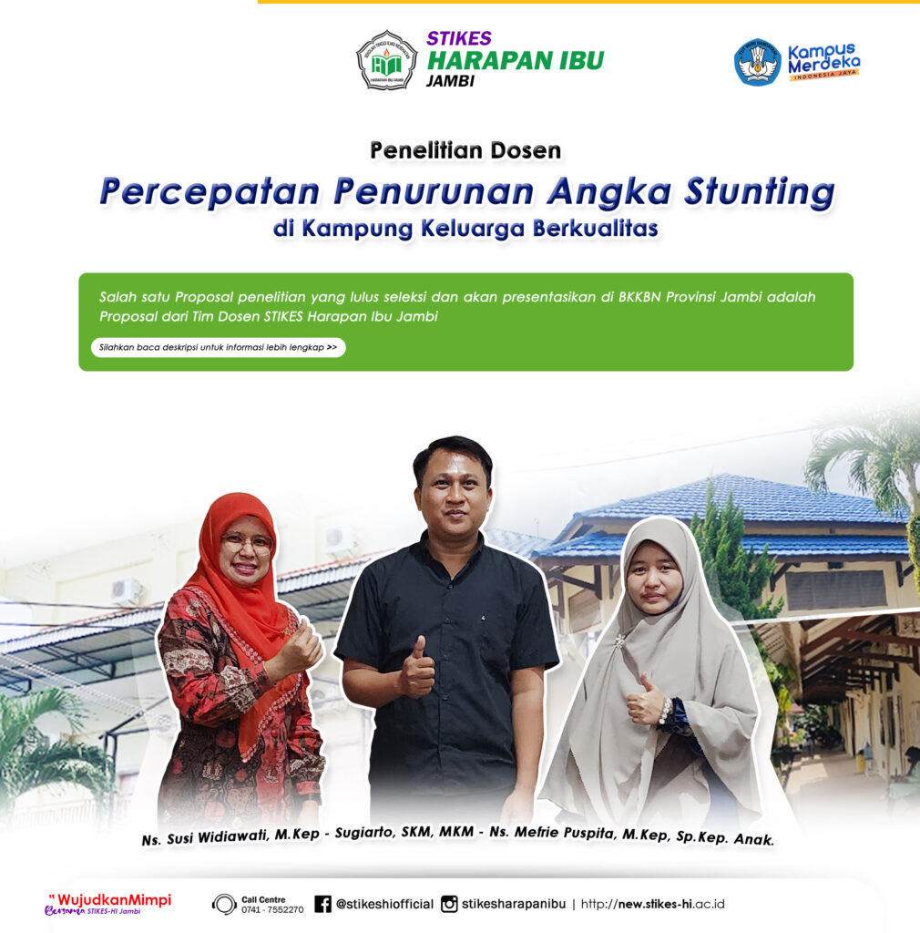 Salah satu Proposal penelitian yang lulus seleksi dan akan presentasikan di BKKBN Provinsi Jambi adalah Proposal dari Tim Dosen STIKES Harapan Ibu Jambi yang berjudul : “Studi Kasus, Faktor-Faktor Yang Berhubungan Dengan Percepatan Penurunan Stunting Pada Anak Usia Dibawah 5 Tahun di Lokus Kampung Keluarga Berkualitas” Tim Penulis proposal penelitian tersebut adalah Dosen Program Studi Profesi Ners (Ns. Susi Widiawati, M.Kep dan Ns. Mefrie Puspita, M.Kep, Sp.Kep. Anak. Dan dosen Program Studi Kesehatan Masyarakat (Sugiarto, SKM, MKM)