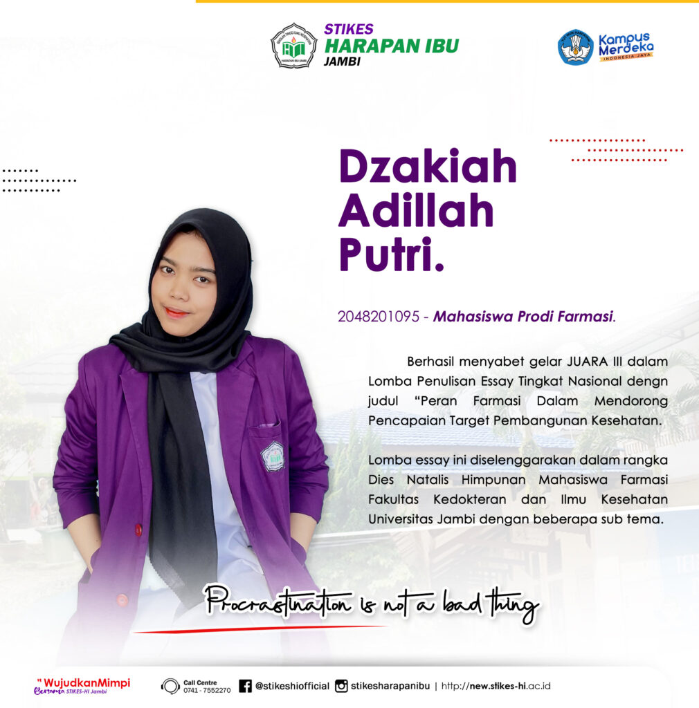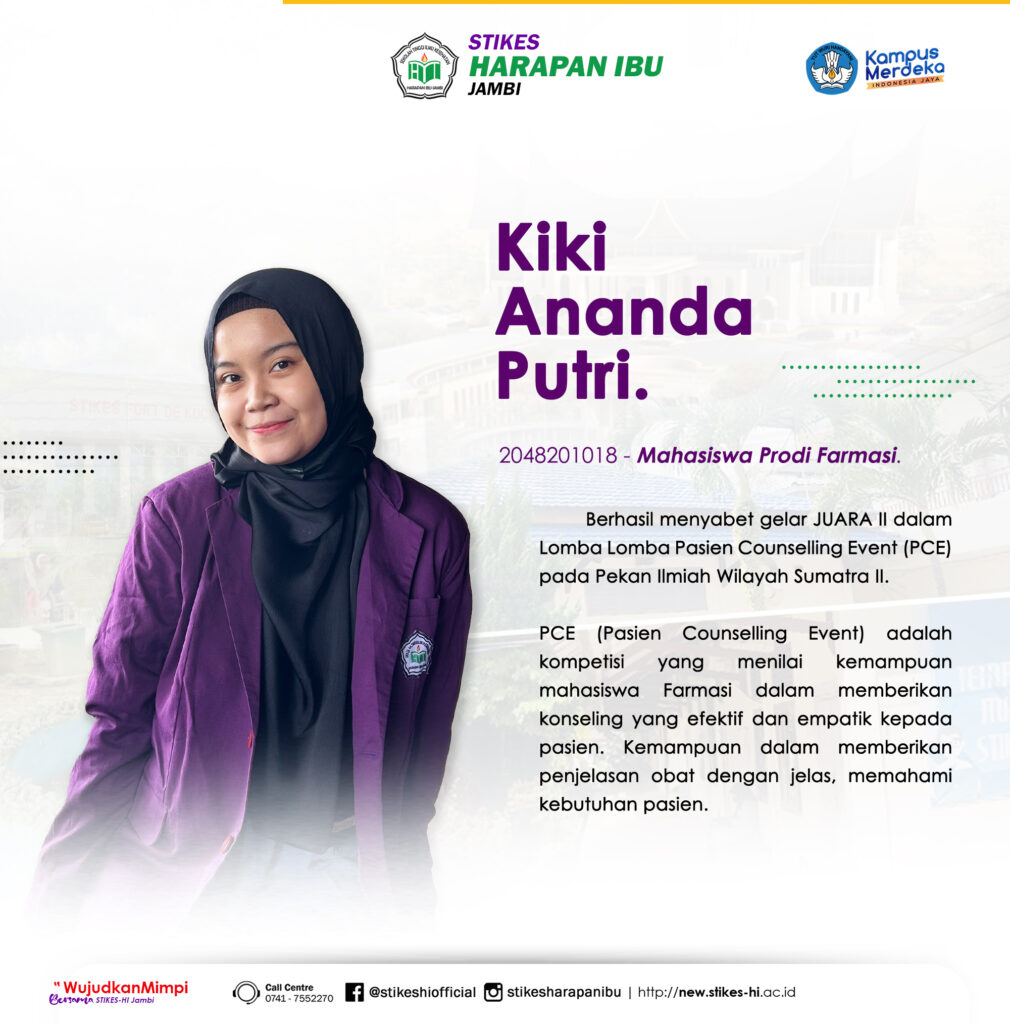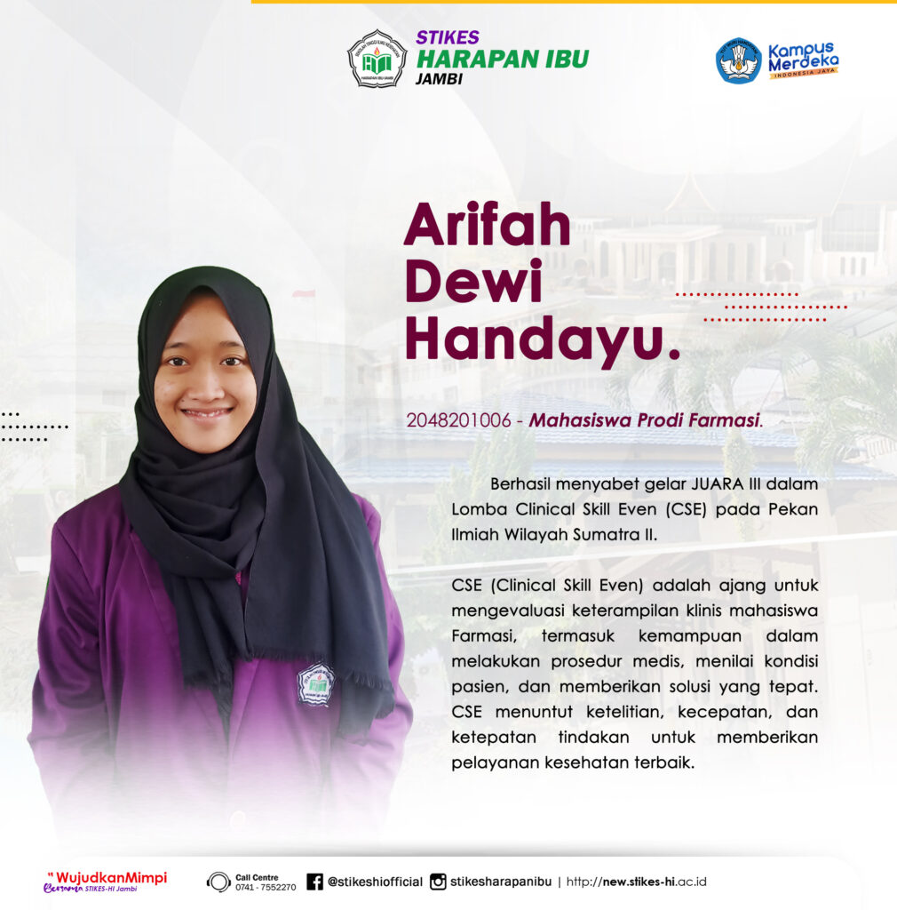 Sorak sorai kebanggaan kami menggema dibeberapa kabupaten kota tempat diselenggarakannya kompetensi mahasiswa yang bergensi ini. Ada tiga srikandi STIKES Harapan Ibu Jambi yang berhasil kluar mendapatkan hasil yang luarbiasa dengan mmasing – masing kategori, Kiki Ananda Putri Juara II dalam Lomba Lomba Pasien Counselling Event (PCE) pada Pekan Ilmiah Wilayah Sumatra II. PCE (Pasien Counselling Event) adalah kompetisi yang menilai kemampuan mahasiswa Farmasi dalam memberikan konseling yang efektif dan empatik kepada pasien. Kemampuan dalam memberikan penjelasan obat dengan jelas, memahami kebutuhan pasien. Arifah Dewi Handayu Juara III dalam Lomba Clinical Skill Even (CSE) pada Pekan Ilmiah Wilayah Sumatra II. PCE (Pasien Counselling Event) adalah kompetisi yang menilai kemampuan mahasiswa Farmasi dalam memberikan konseling yang efektif dan empatik kepada pasien. Kemampuan dalam memberikan penjelasan obat dengan jelas, memahami kebutuhan pasien. Dzakiah Adillah Putri berhasil menyabet gelar Juara III dalam Lomba Penulisan Essay Tingkat Nasional dengn judul “Peran Farmasi Dalam Mendorong Pencapaian Target Pembangunan Kesehatan. Lomba essay ini diselenggarakan dalam rangka Dies Natalis Himpunan Mahasiswa Farmasi Fakultas Kedokteran dan Ilmu Kesehatan Universitas Jambi dengan beberapa sub tema.