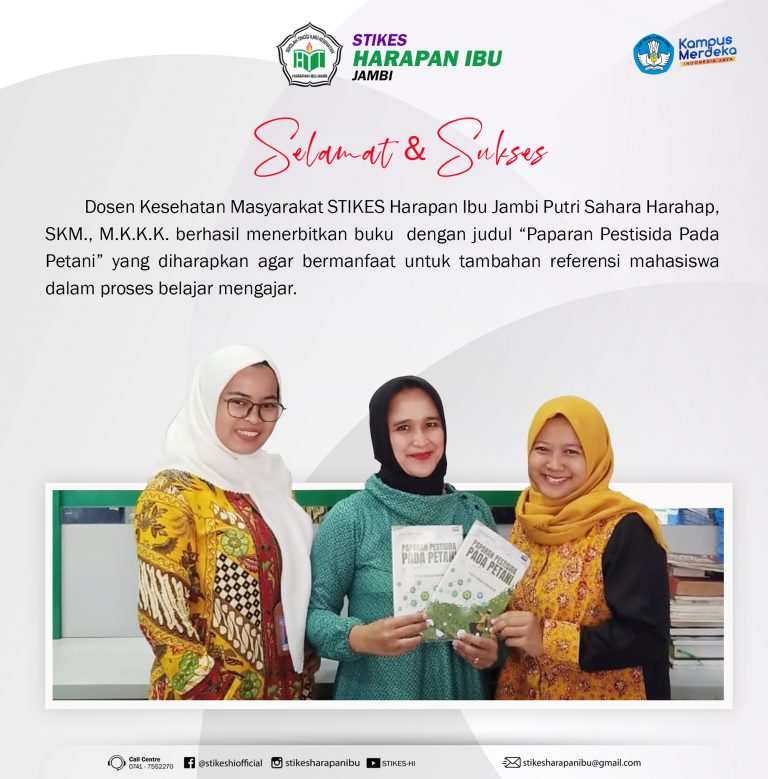 Dosen Kesehatan Masyarakat STIKES Harapan Ibu Jambi Putri Sahara Harahap, SKM., M.K.K.K. berhasil menerbitkan buku dengan judul “Paparan Pestisida Pada Petani” yang diharapkan agar bermanfaat untuk tambahan referensi mahasiswa dalam proses belajar mengajar.